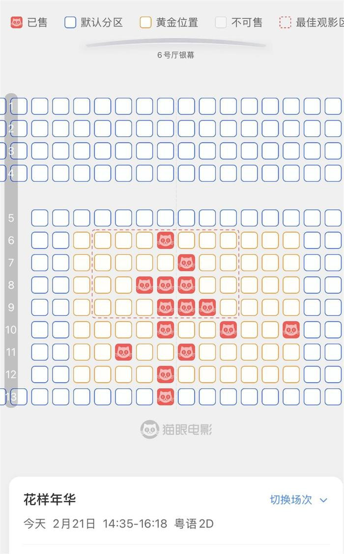 “我在选座的时候发现,居然好几个观众都跟我一样,是自己一个人来看《花样年华》,而且也都选择了最边边、不接触人的座位,看到这个选座图,我忍不住笑了起来,就截图做个纪念。”王女士分析,这些观众应该都和她一样是梁朝伟的影迷,“大家都知道梁朝伟是‘社恐’,他看电影的时候最怕旁边有人,有时候会把自己左右的座位都买了,就是怕与人有接触。你看我截的这张图里,这几个观众都选了不挨着其他人的座位,很显然也是不想和别人挨着坐。粉丝果然似偶像啊。”