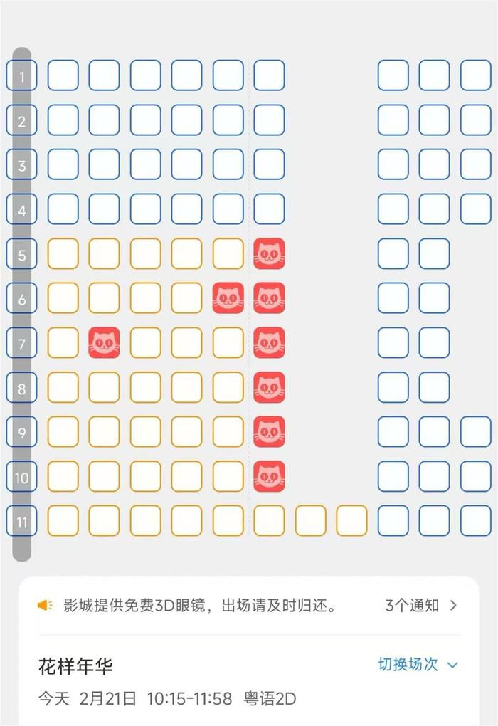 记者随机搜索了2月21日《花样年华》武汉几家影城的购票页面,发现确实有部分场次的观众选座时“生怕挨着别人”,让人想起网络上流传的“北欧公交车选座风”,而这些观众也都是独自观影。
